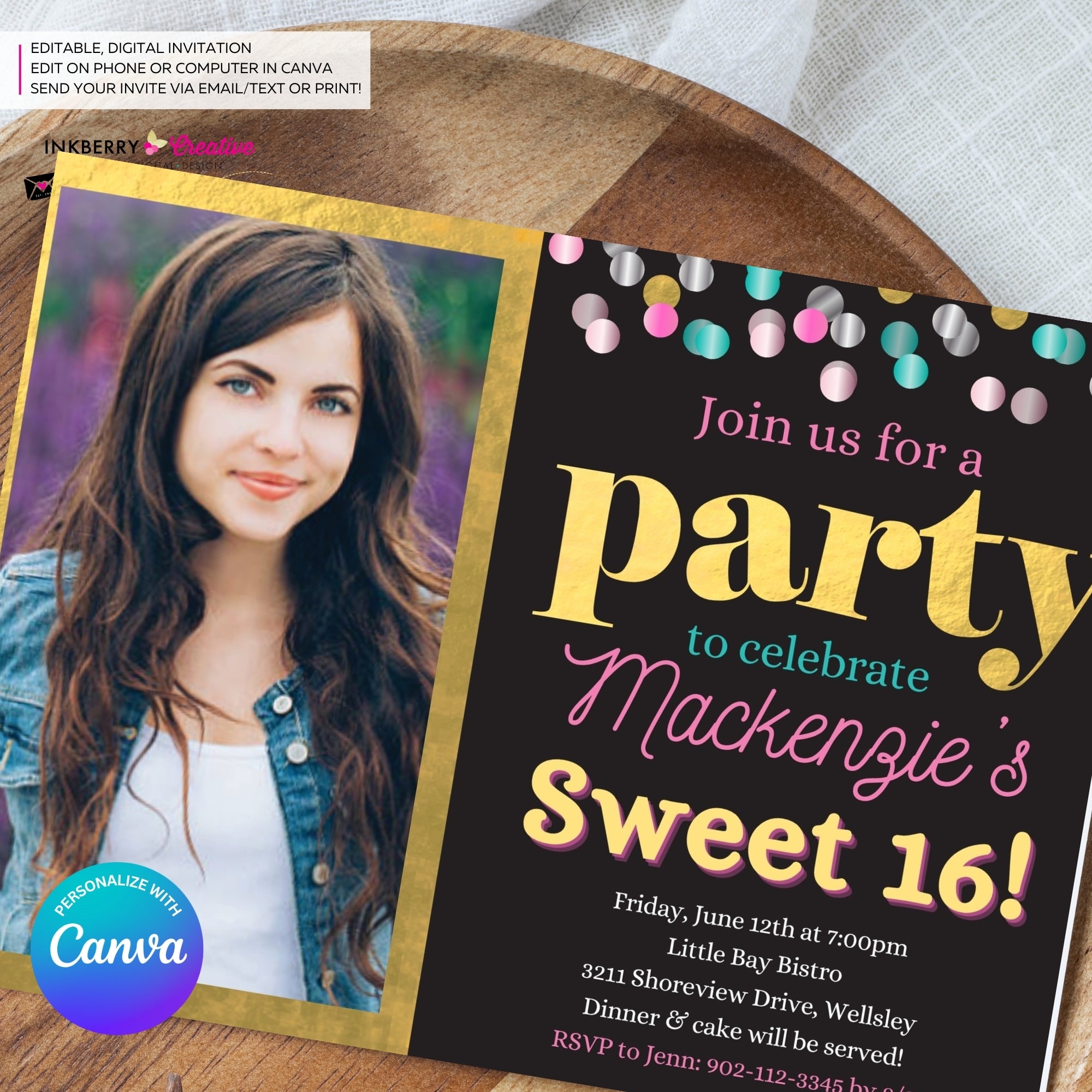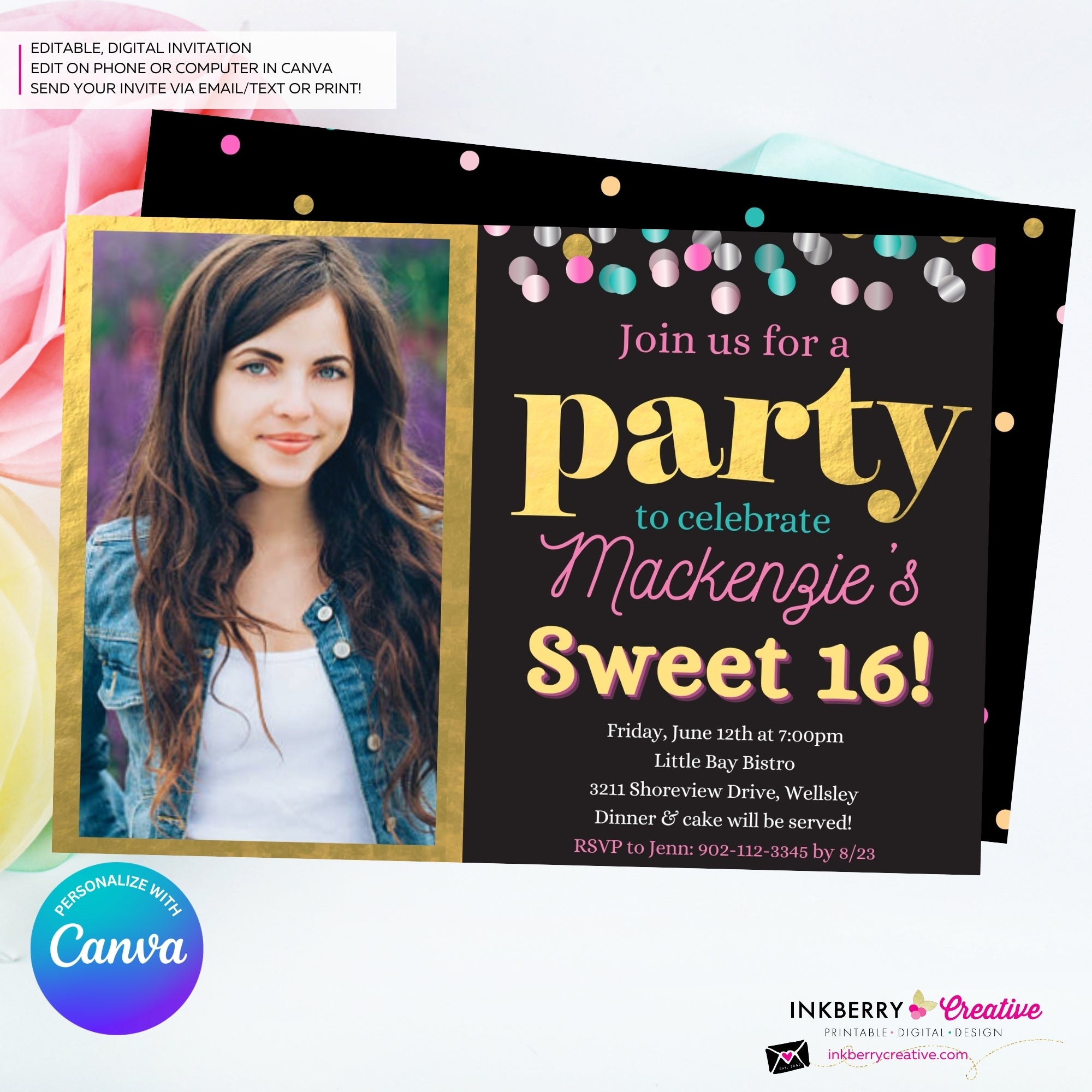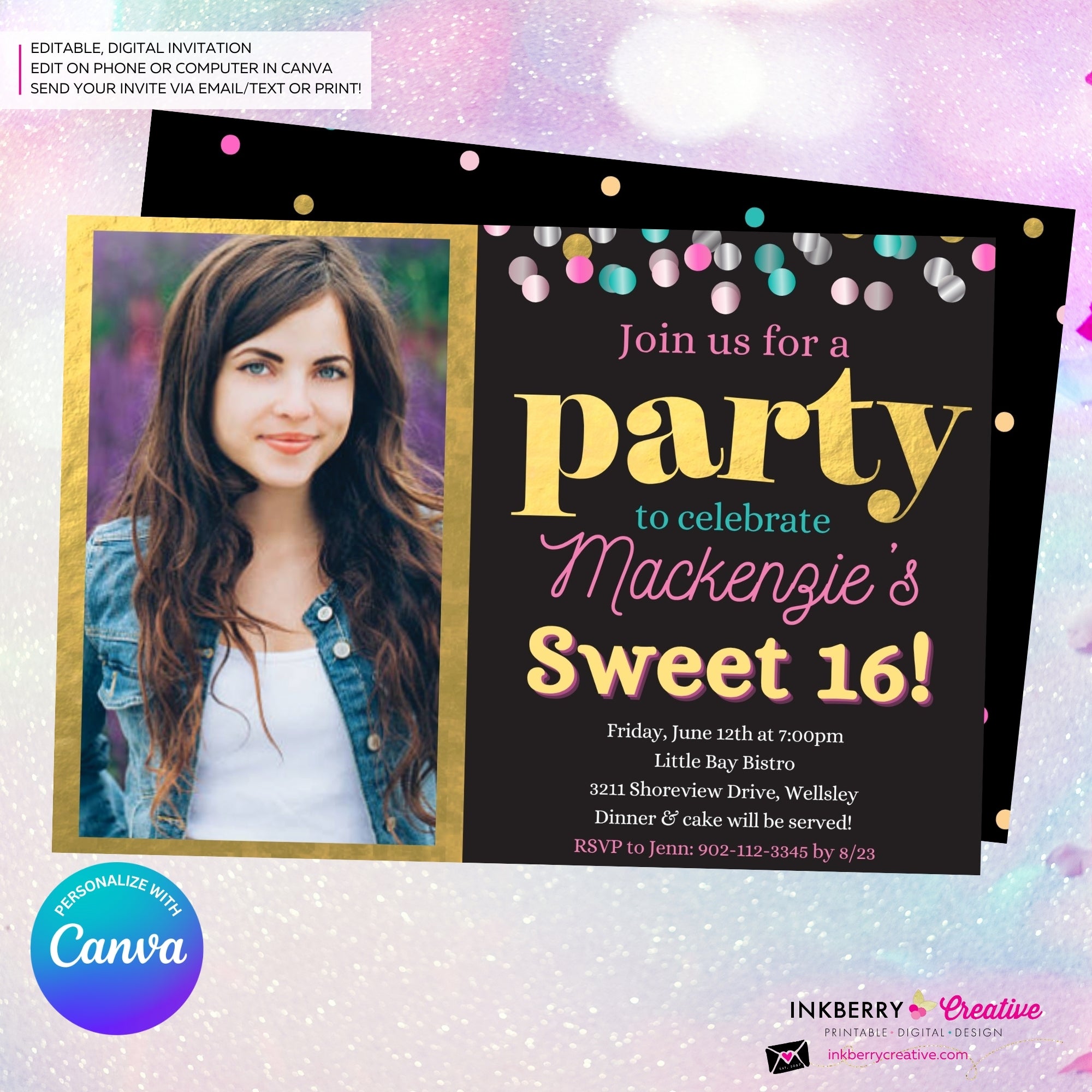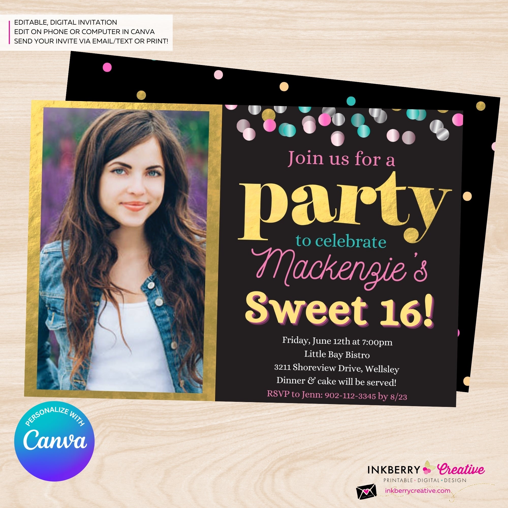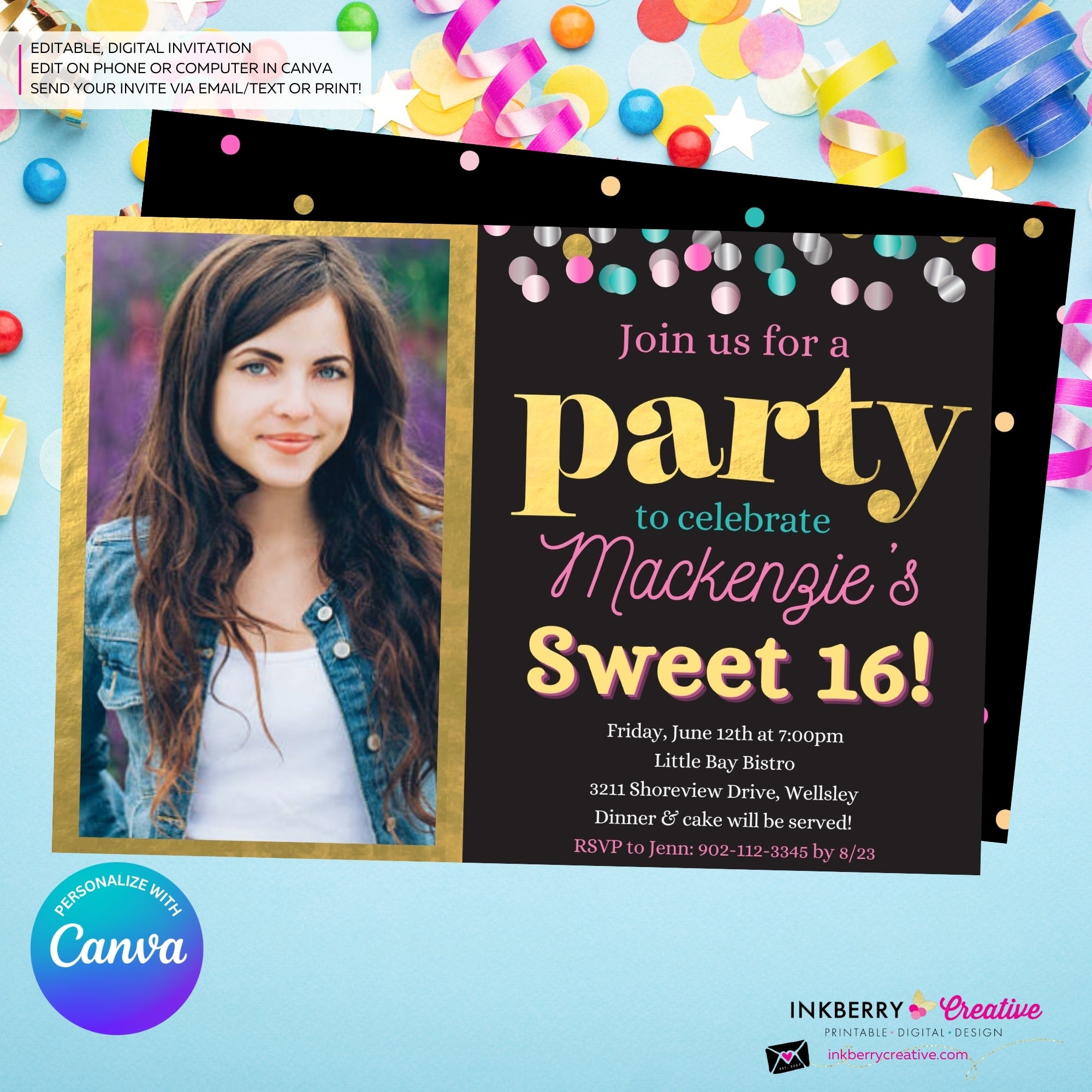 Confetti Pop Photo Party Invitation - Any Age, Any Occasion, Gold, Aqua, Pink Confetti, Birthday Photo invite, Sweet 16, Edit in Canva