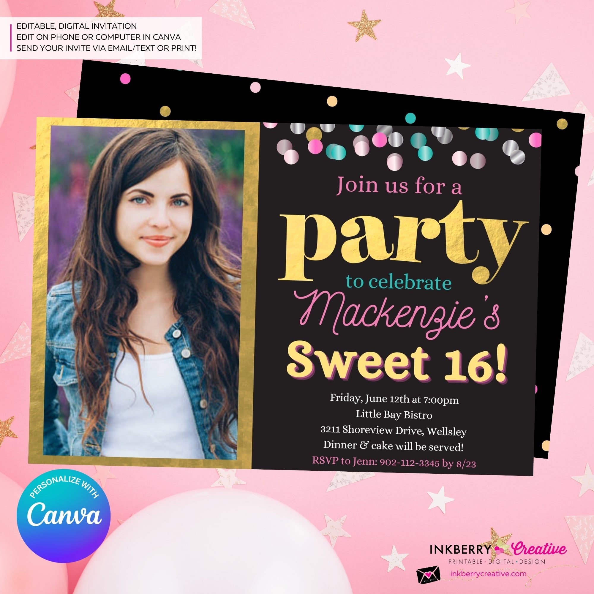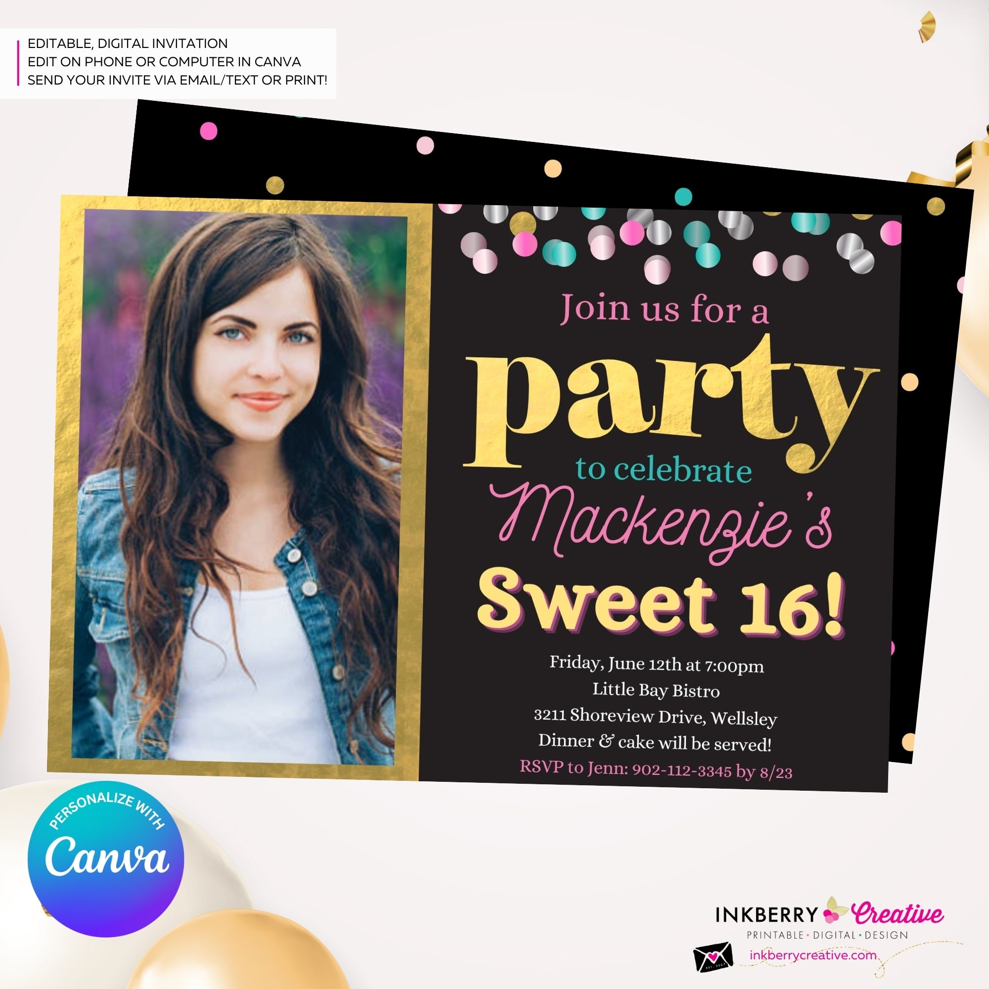 Confetti Pop Any Age Any Occasion Photo Party Invitation - Gold, Aqua, Pink Confetti, Birthday Photo invite, Sweet 16, Graduation, Instant Download, Editable, Printable - Edit in Canva