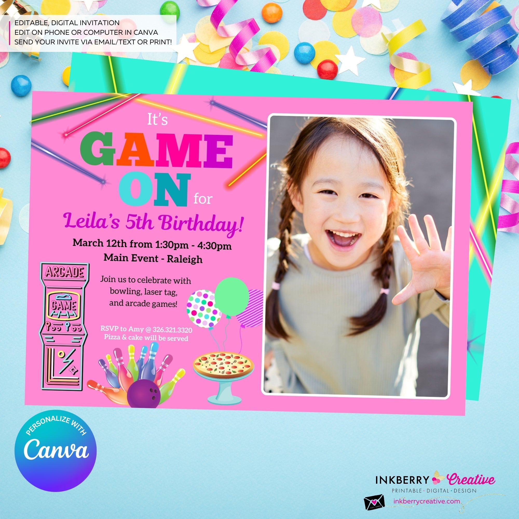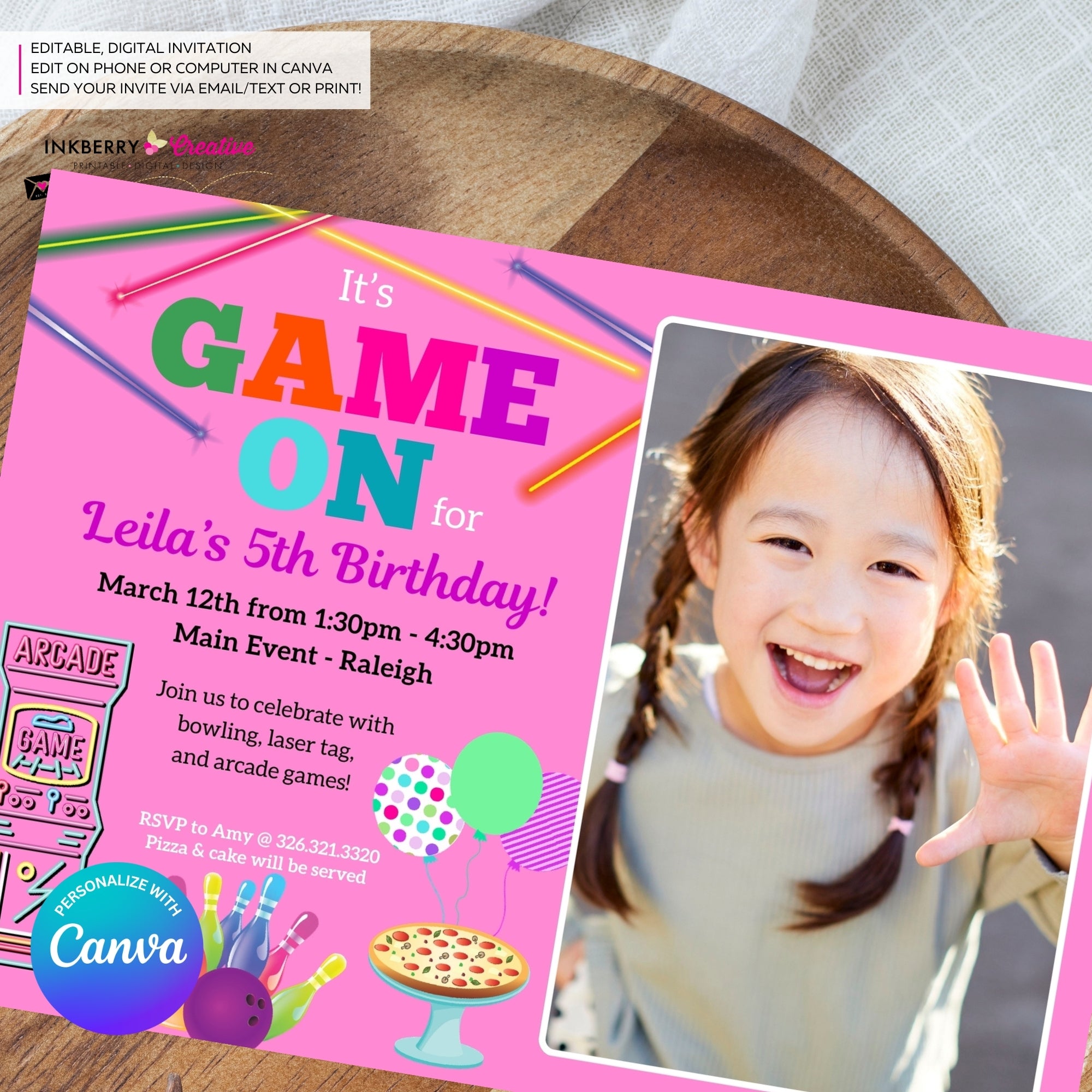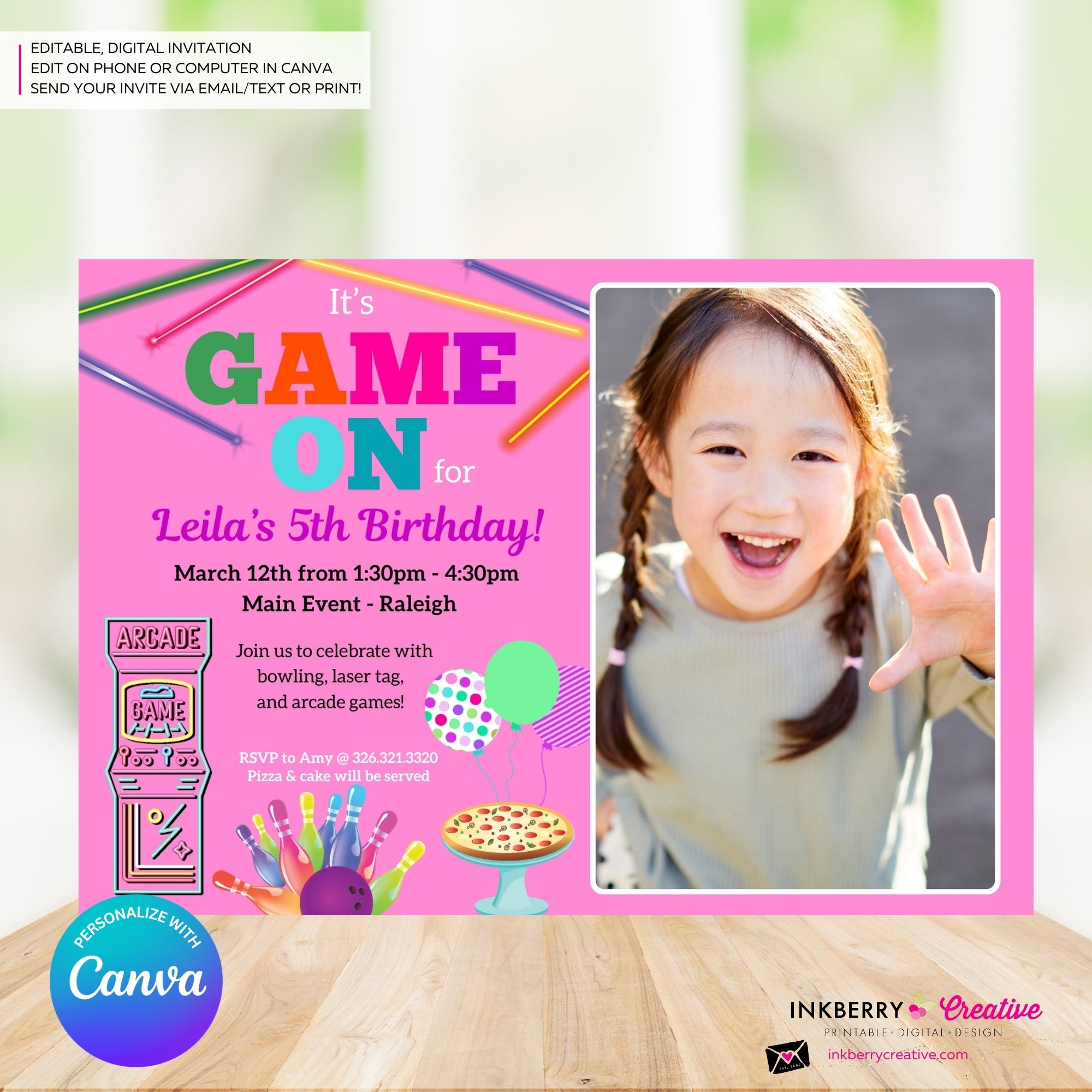 Game On Girls Pink PHOTO Arcade, Pizza, Bowling Birthday Party Digital, Printable Invitation - Edit in Canva