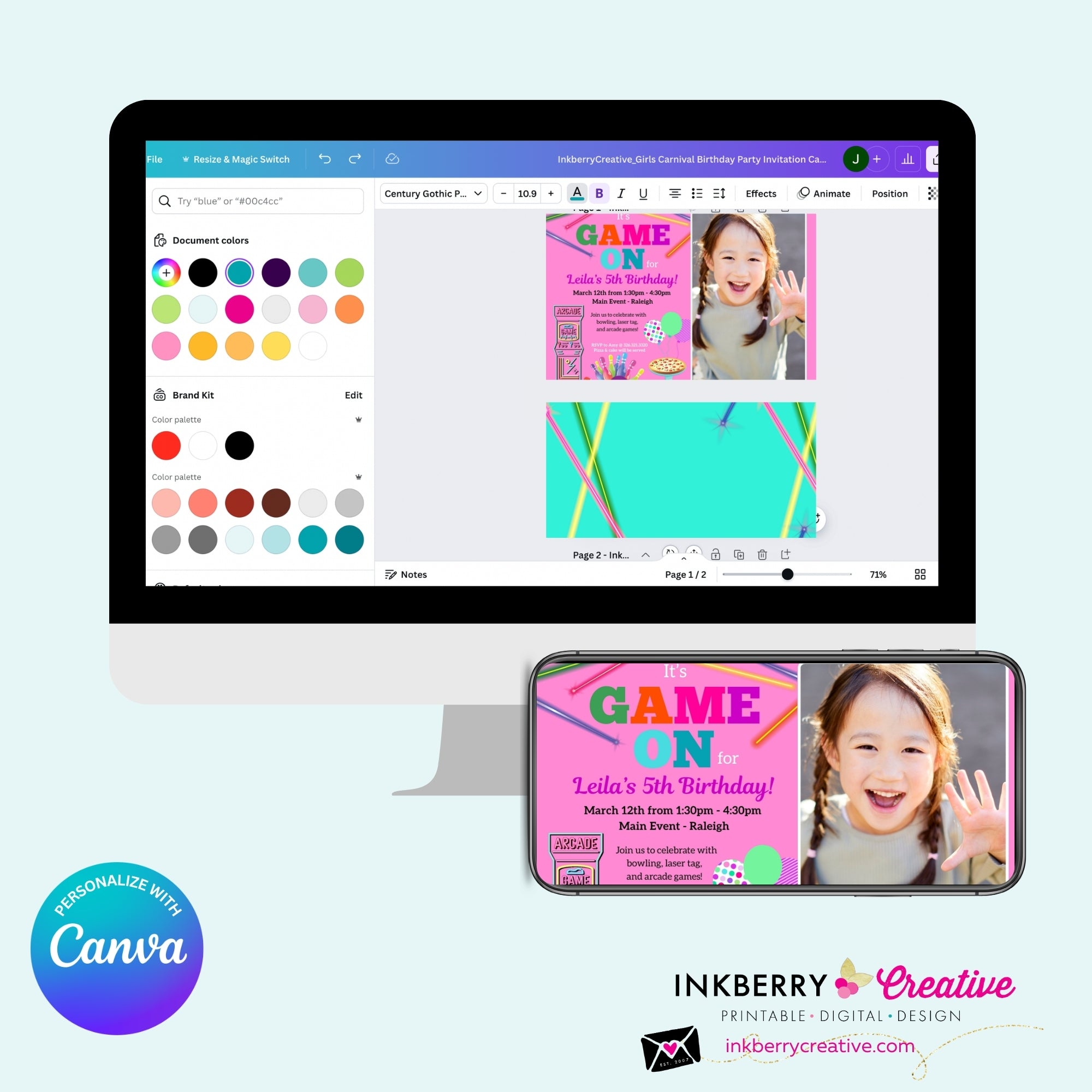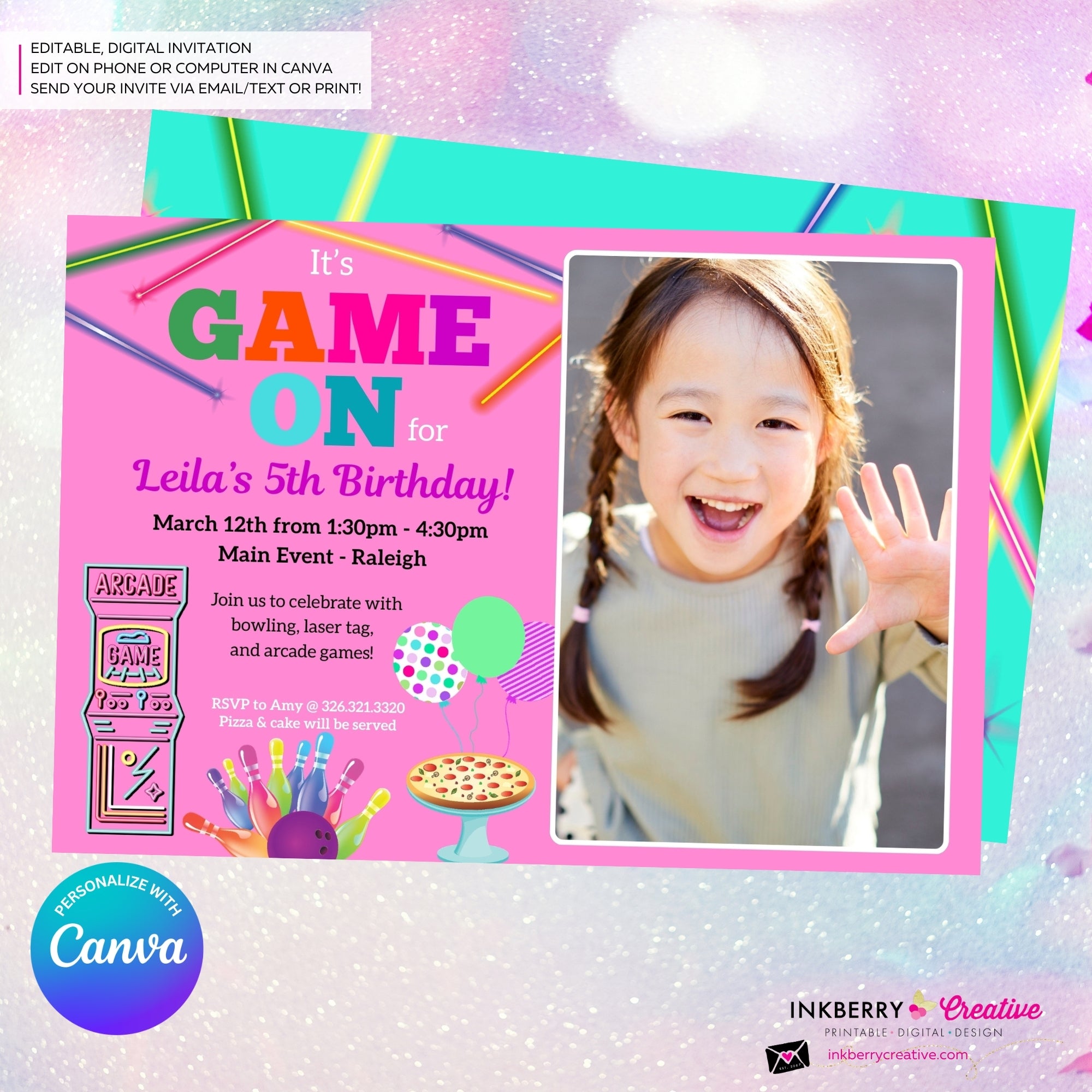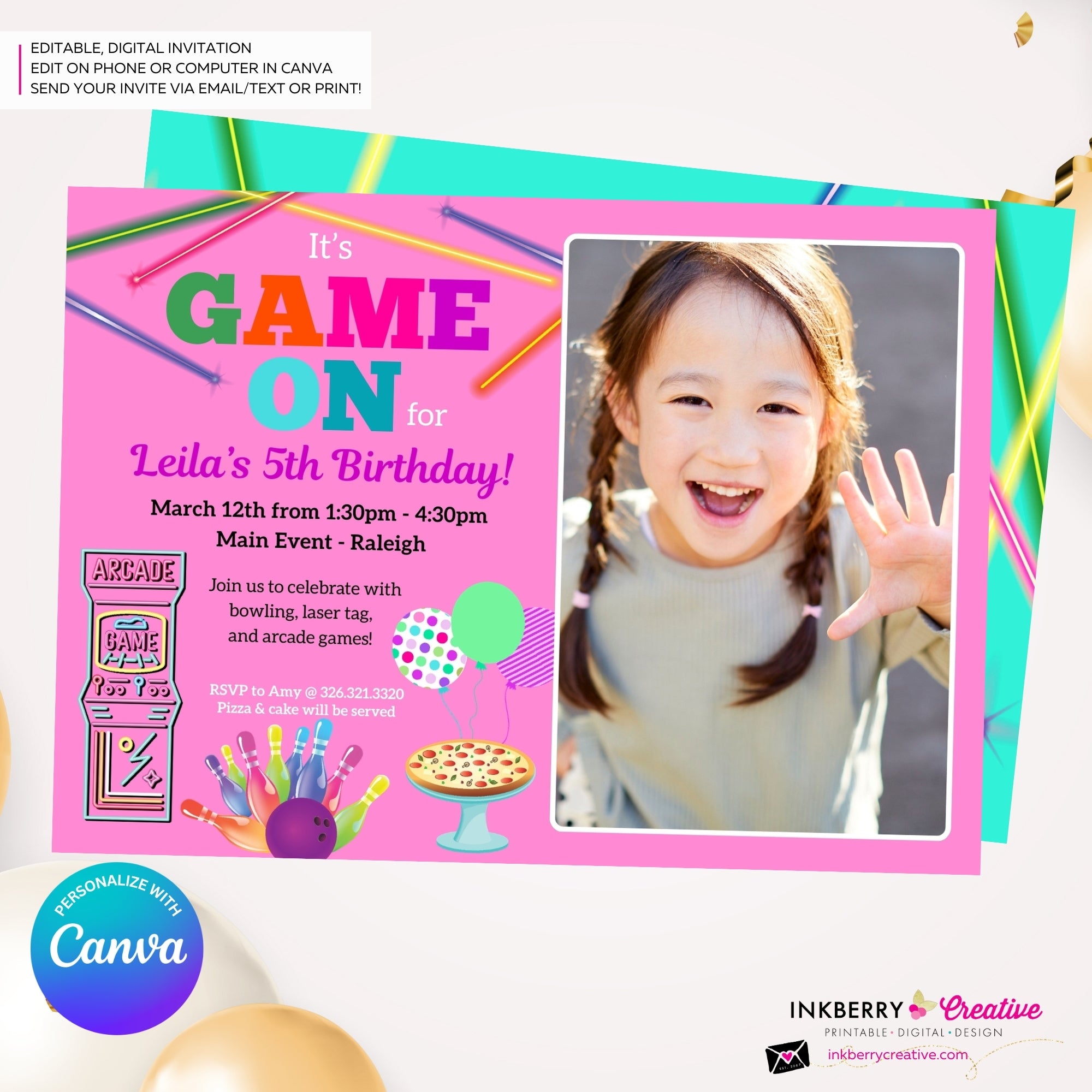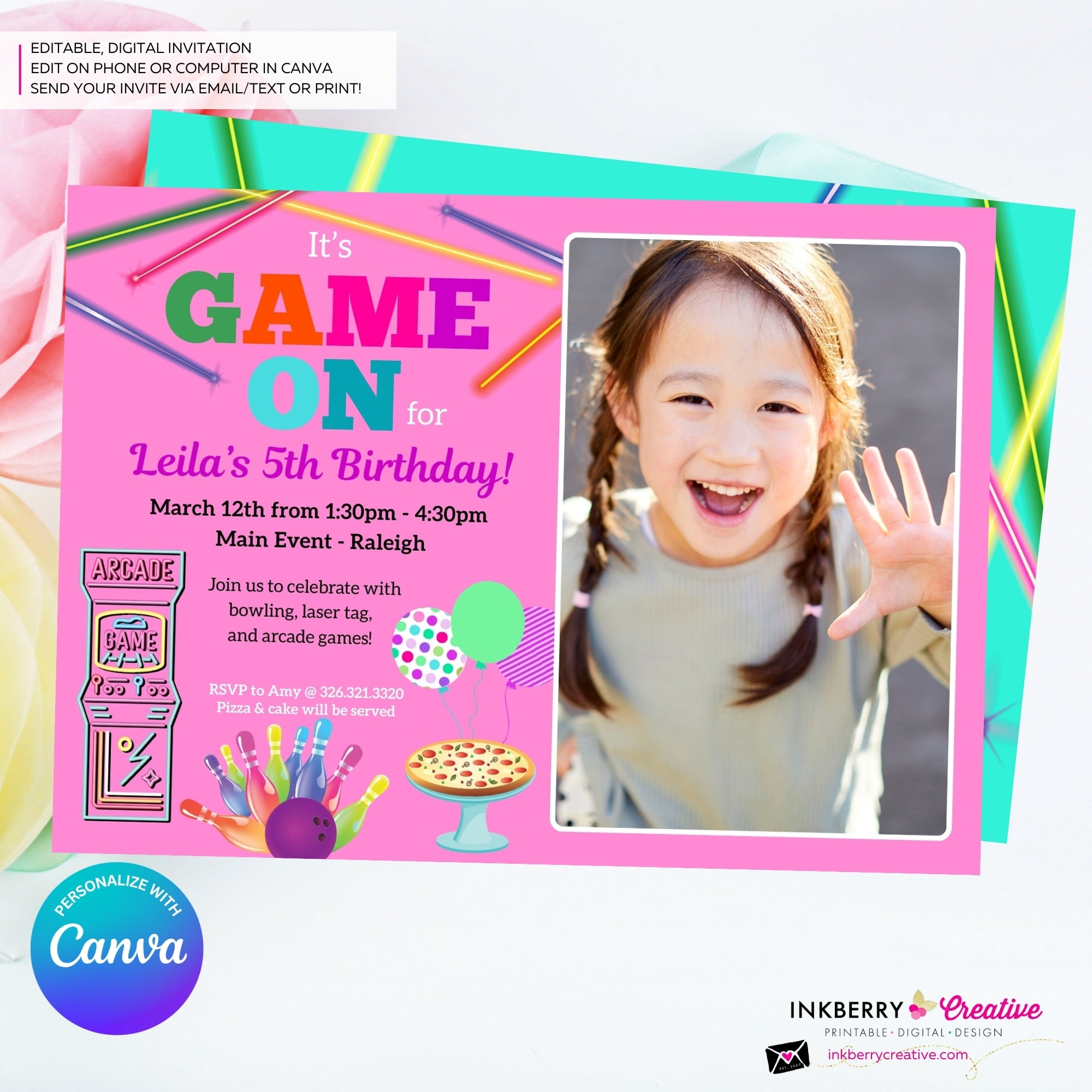 Game On Girls Pink PHOTO Arcade, Pizza, Bowling Birthday Party Digital, Printable Invitation - Edit in Canva