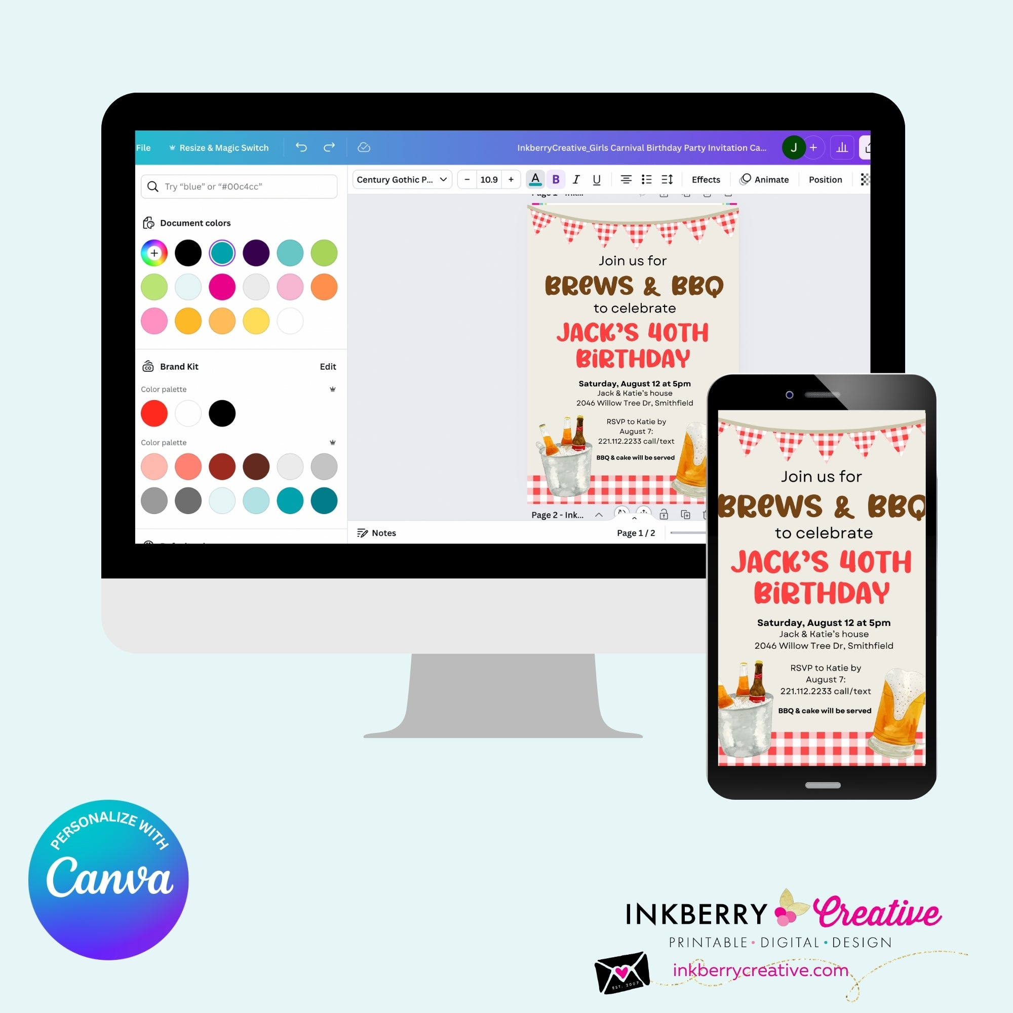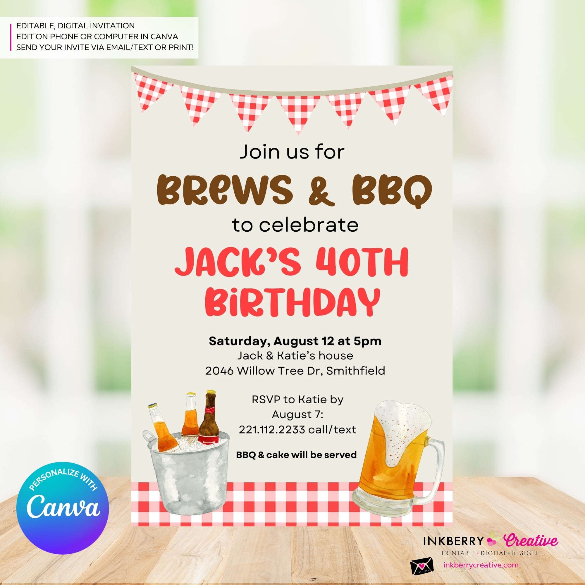 Brews & BBQ Backyard Cookout, Barbecue Theme Birthday Party or Shower Invitation - Personalize and Edit in Canva