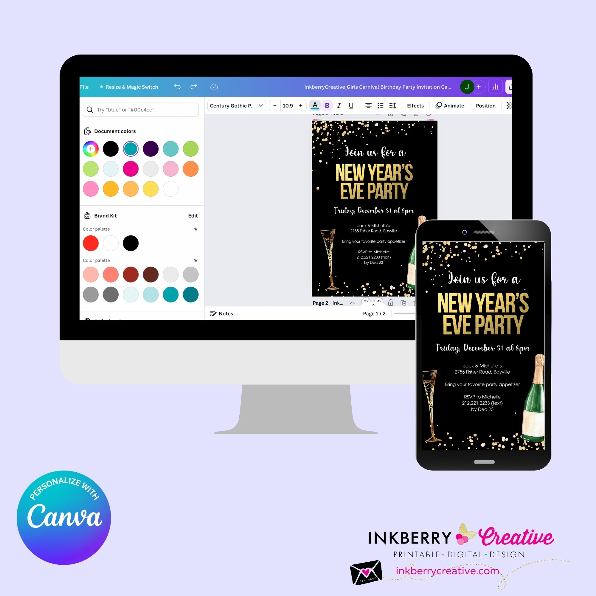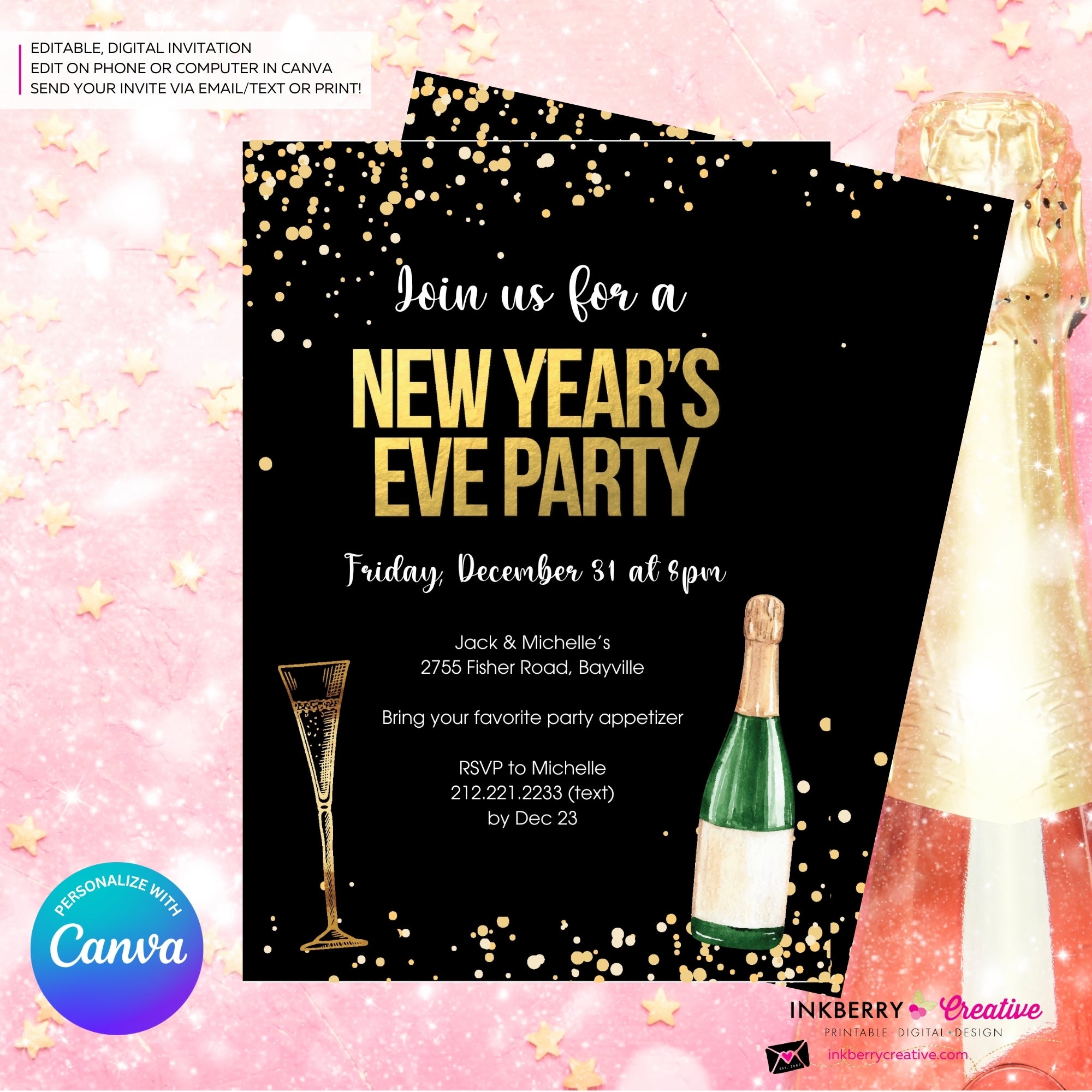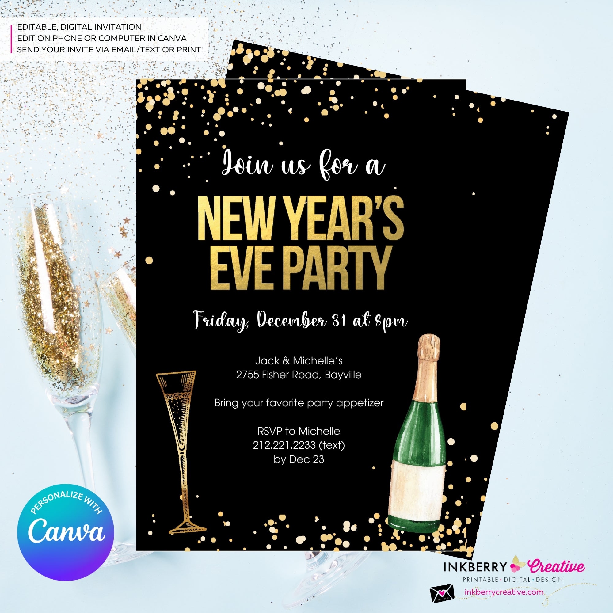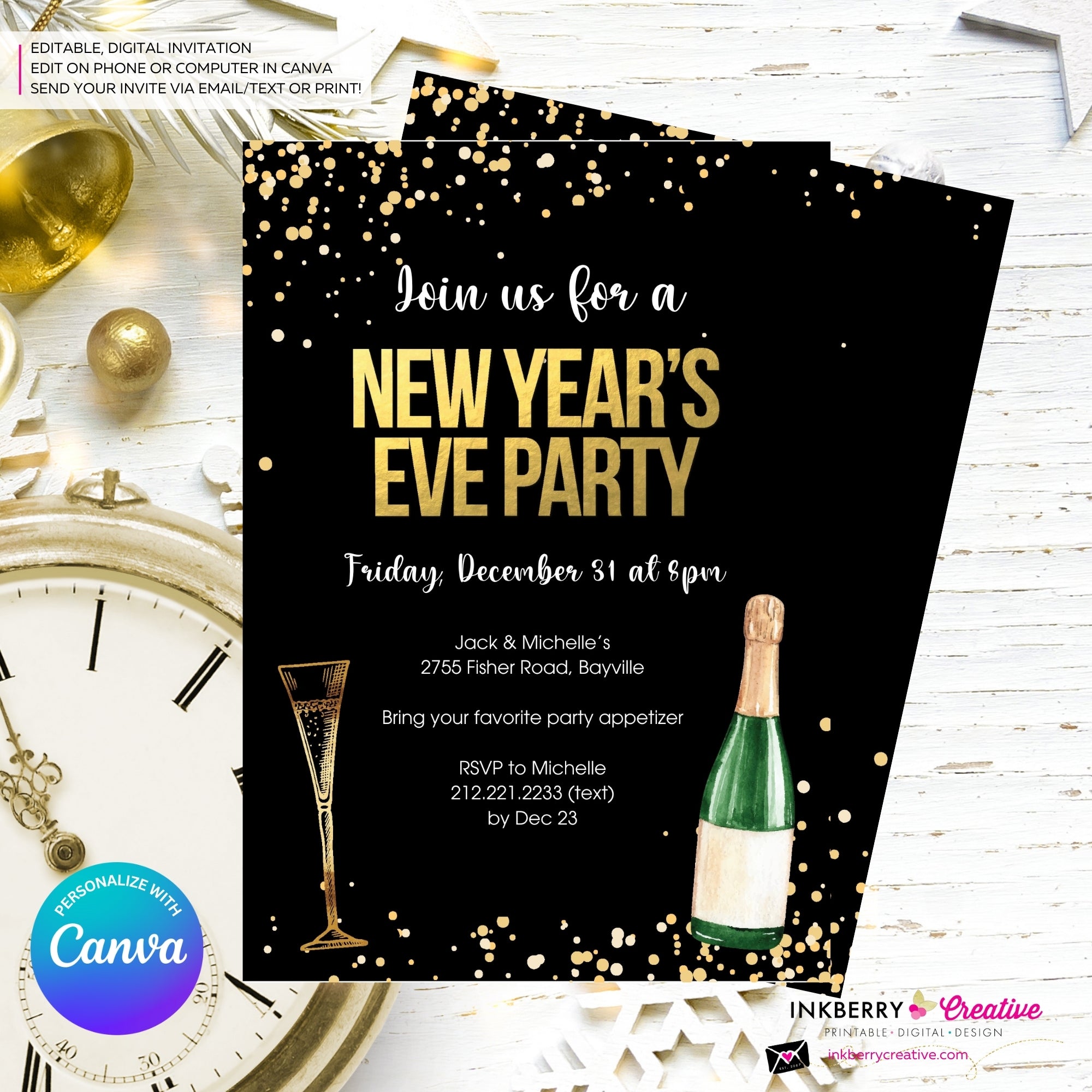 Throw an unforgettable New Year's Eve party with our festive and customizable digital invitation! Perfectly sized at 5x7 inches, this delightful invitation features a front and back design, ready to be personalized to your heart’s content.