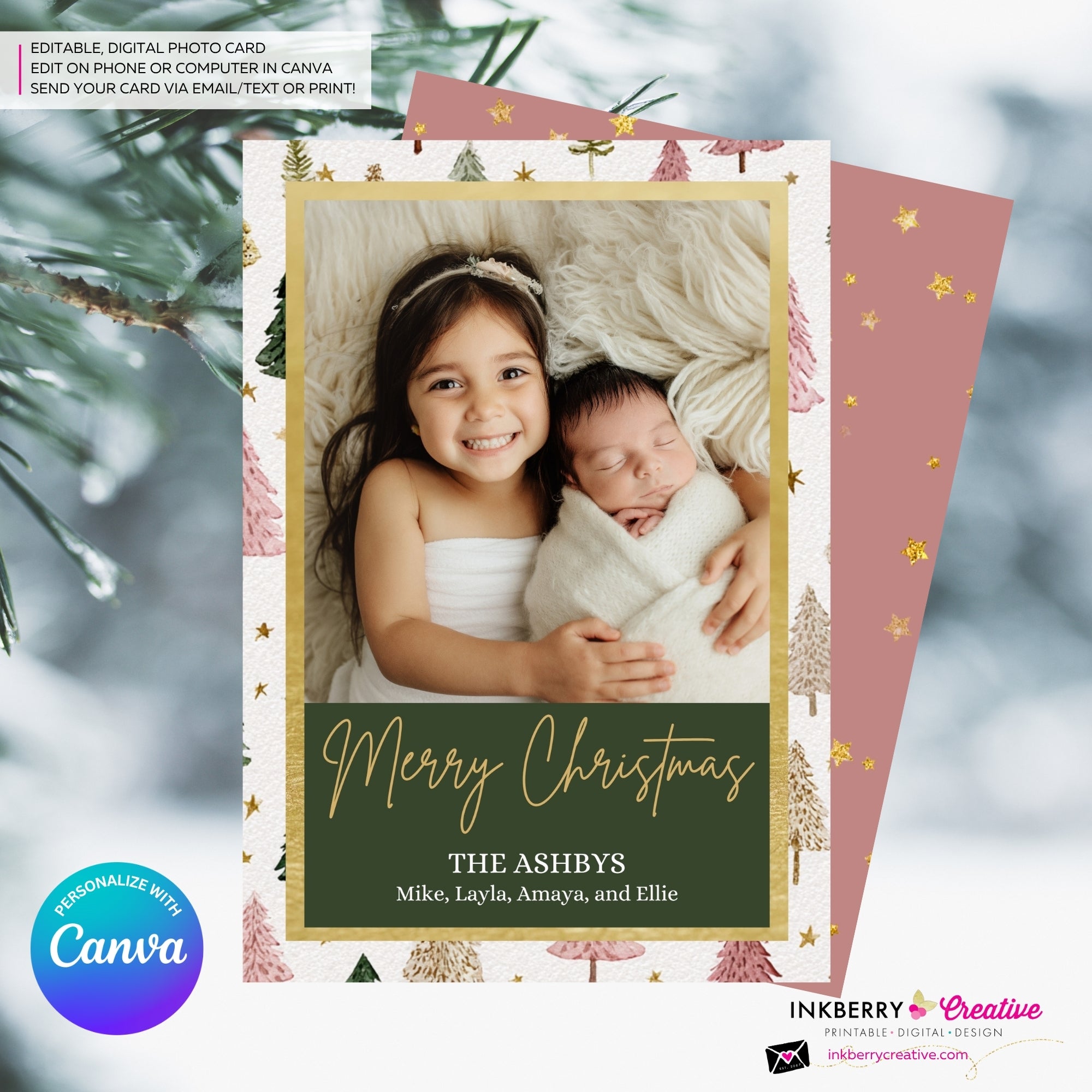 Boho Painted Trees & Stars Christmas Photo Card, Family Holiday Photo Card, Custom Colors, Email Christmas Card, Editable in Canva