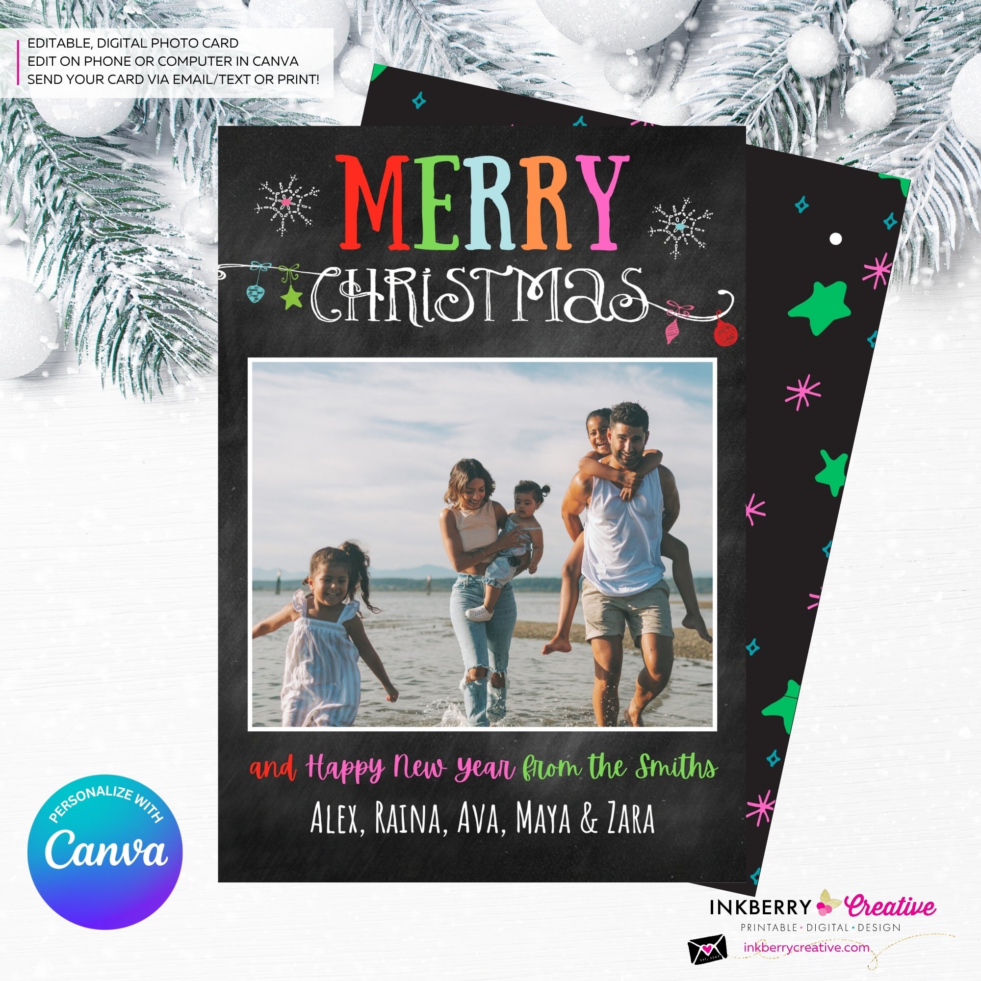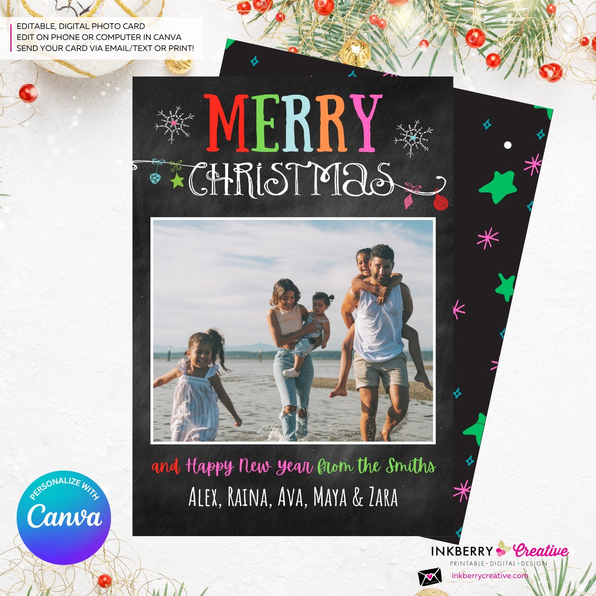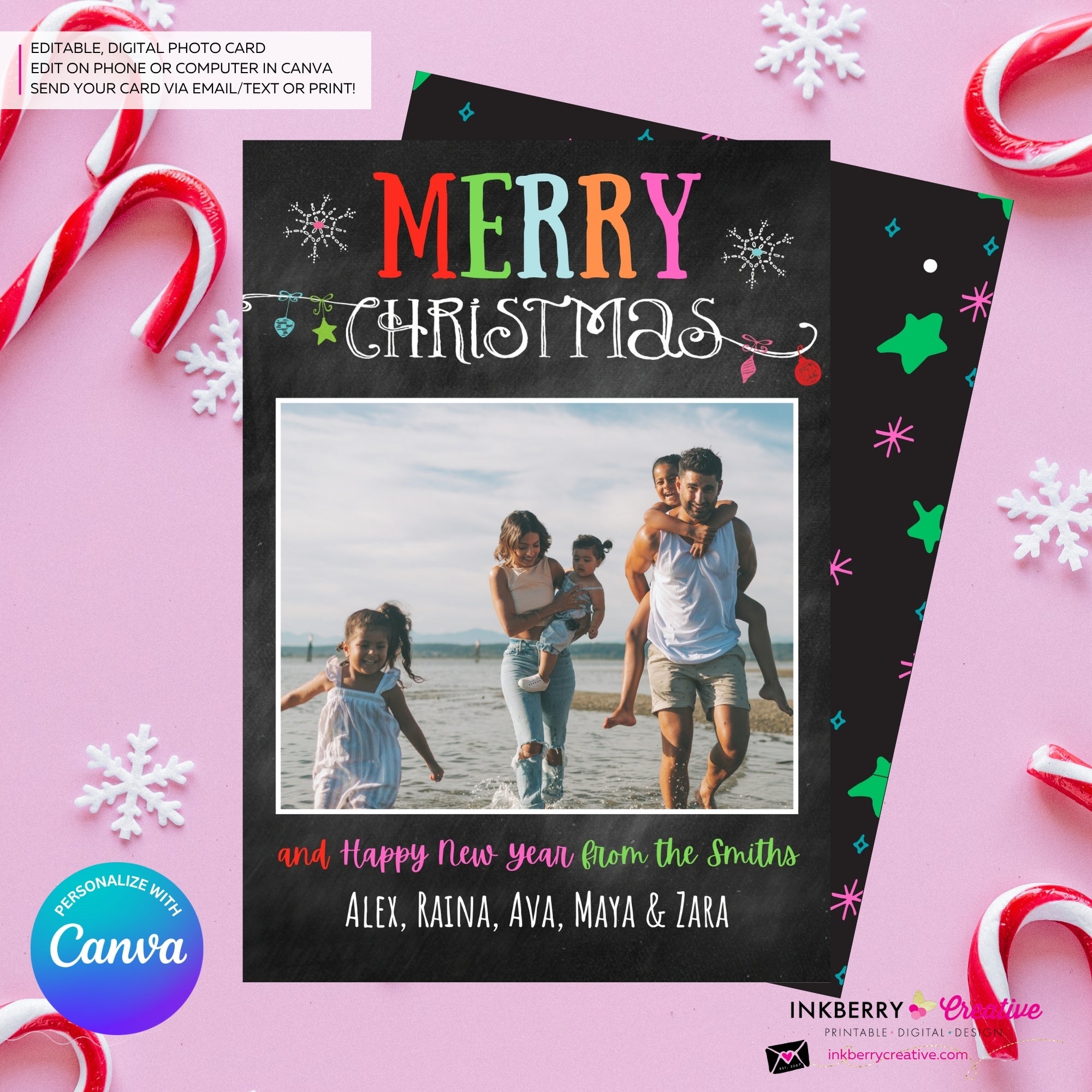 Chalkboard Ornaments Merry Christmas Photo Card, Family Holiday Photo Card, Email Christmas Card, Editable in Canva