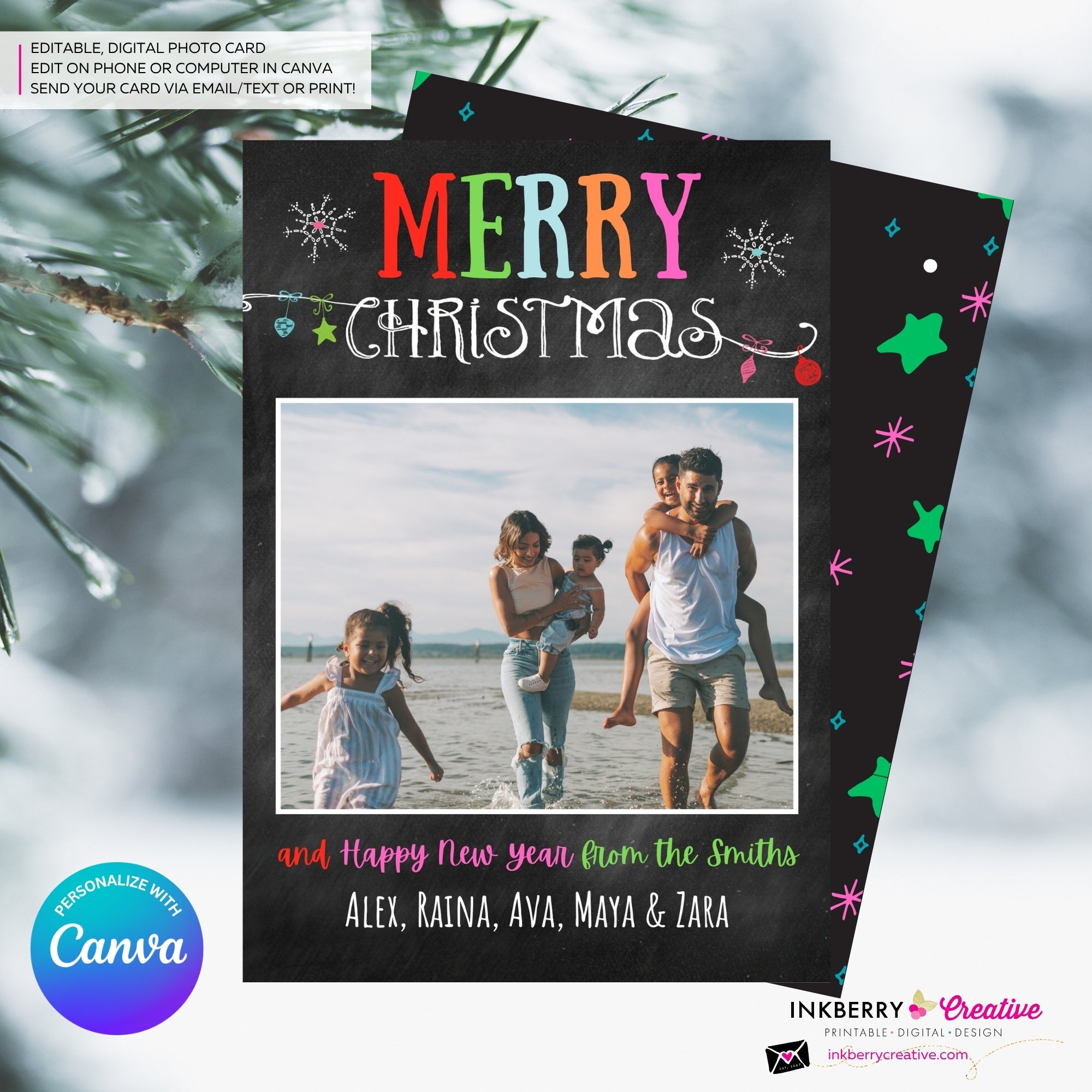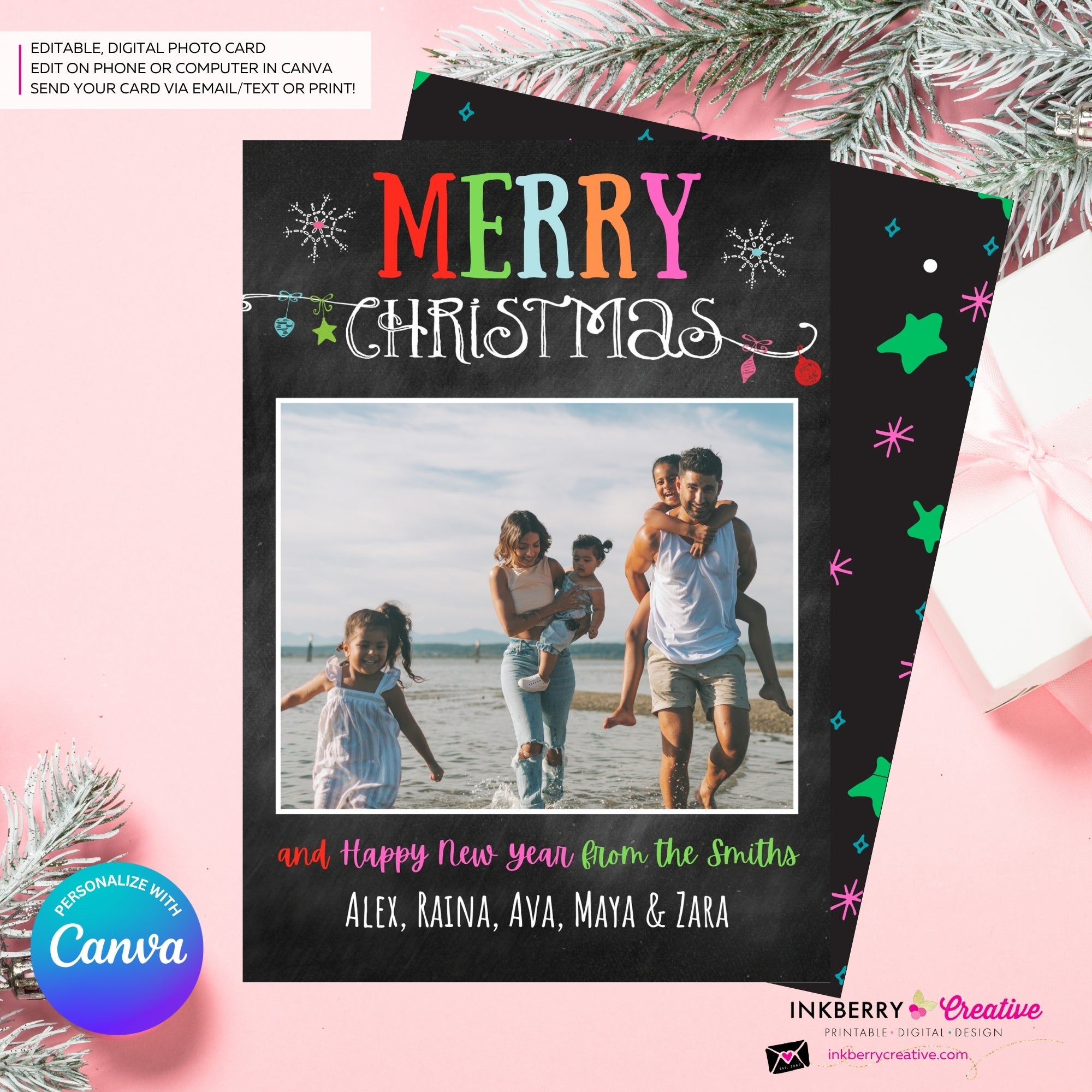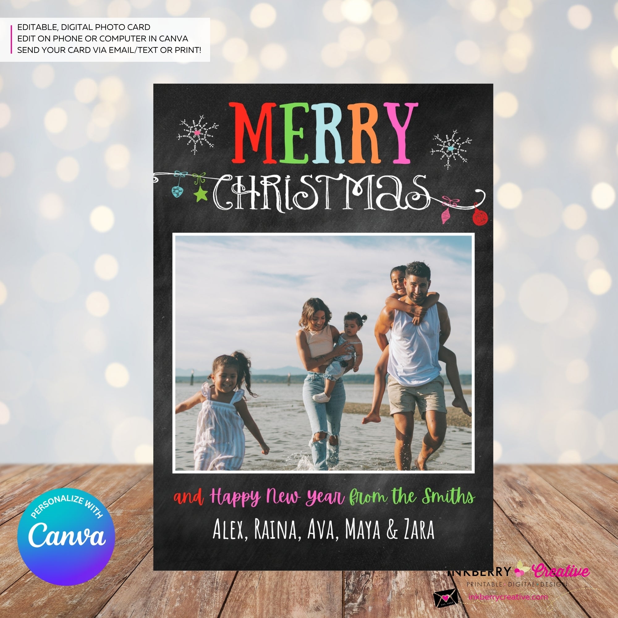 Chalkboard Ornaments Merry Christmas Photo Card, Family Holiday Photo Card, Email Christmas Card, Editable in Canva