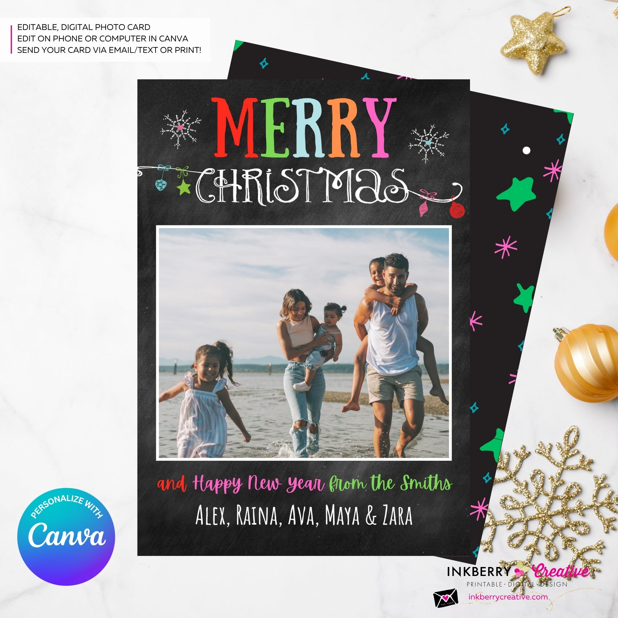 Description: Send warm wishes this season with a beautifully designed, editable Christmas photo card! Sized at 5x7 inches, this festive holiday card features a customizable front and back layout, perfect for showcasing your favorite family photo and personal holiday message.